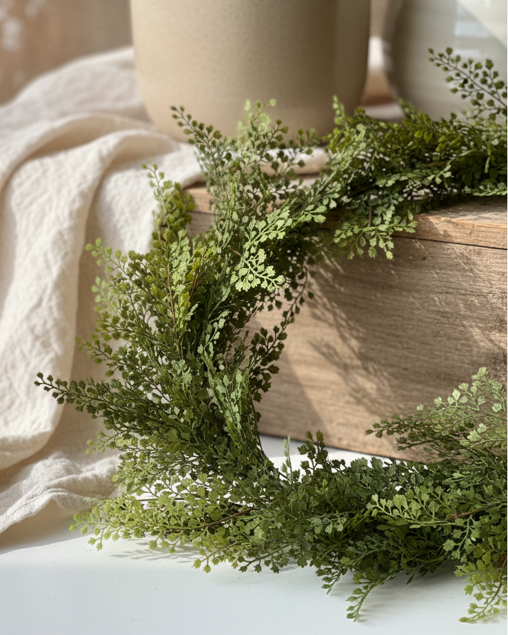 Bring lush, natural texture into your home with our Amara Fern Garland. Designed with full, layered fern fronds, this greenery adds effortless movement and a fresh, organic feel to mantels, shelves, stair rails, and tablescapes. Its classic green tone makes it easy to style year-round, blending beautifully with both seasonal décor and everyday arrangements. A timeless staple for creating a relaxed, nature-inspired look.