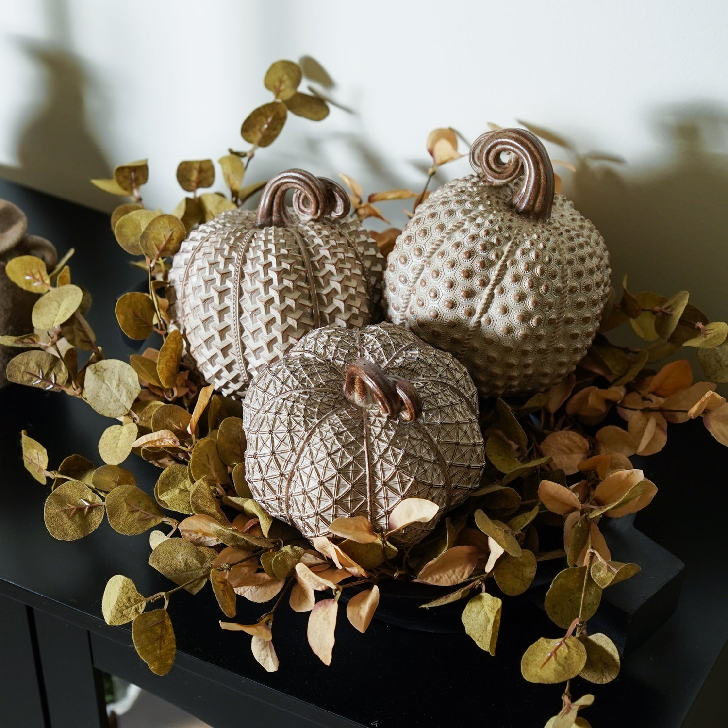Indulge in the sophistication of our Resin Beige Textured Pumpkin Set. Crafted from premium quality resin, this elegant pumpkin boasts a unique and luxurious design that will elevate any space. Its beige color adds a touch of warmth and elegance, making it a perfect addition to your home decor.