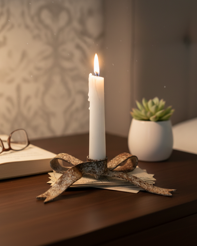 The Rustic Bow Taper Holder blends vintage-inspired charm with a warm, collected feel through its softly distressed finish and sculptural bow detail. Crafted from metal, this piece features a gently aged look that brings character and depth to mantels, shelves, or tabletop displays. Its elongated silhouette creates a beautiful base for taper candles while adding subtle texture and warmth to your décor. Thoughtfully styled and timeless in design, it offers a cozy accent with a touch of rustic elegance.