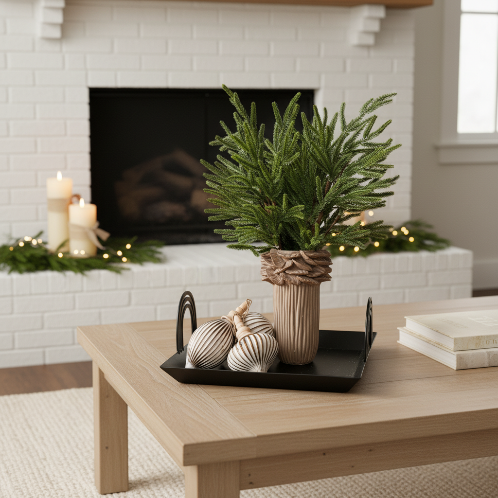 Scatter the Bronze Ornaments along the tray or nest them beside the vase for a warm, festive accent. Finish the scene with a candle or soft twinkle lights to enhance the cozy glow.