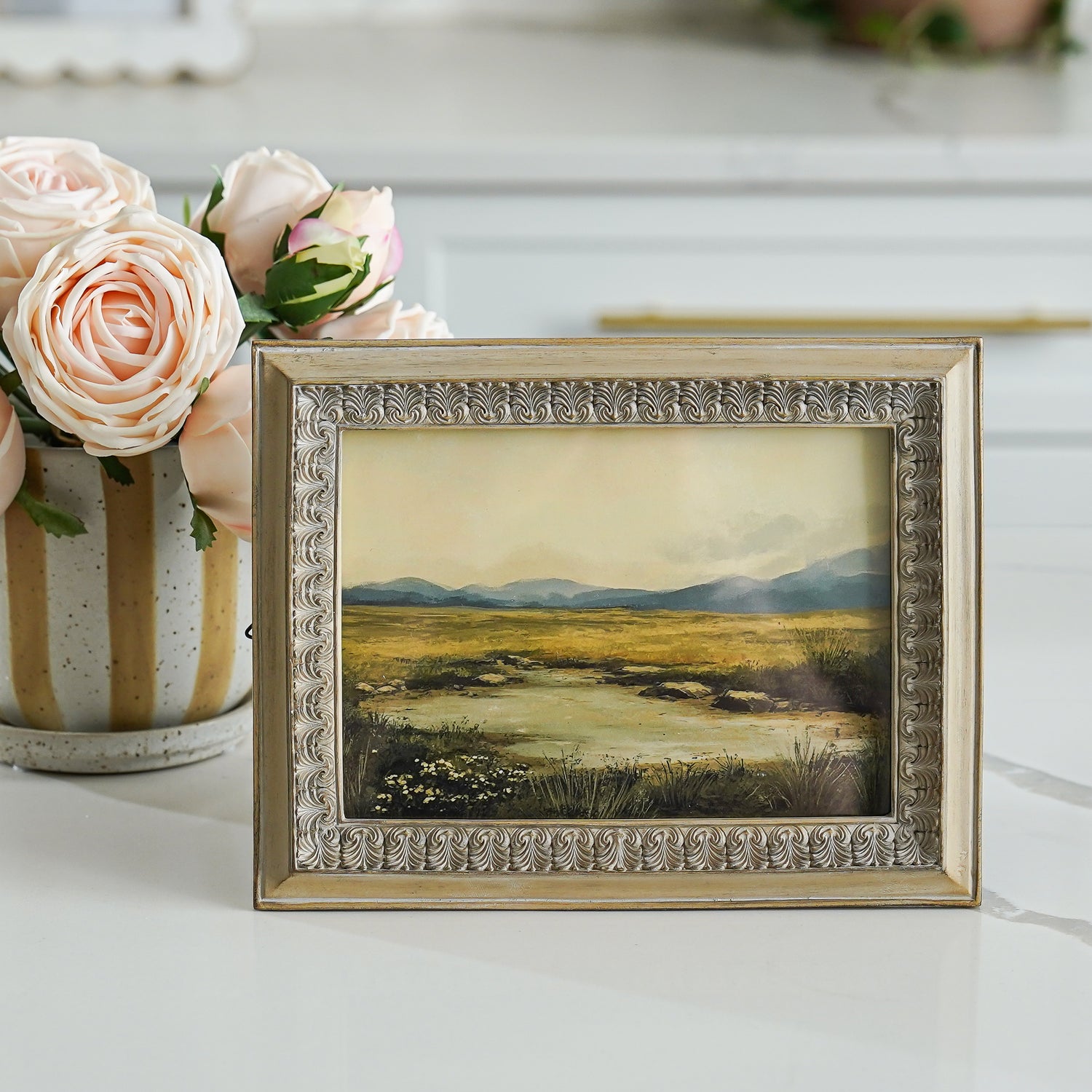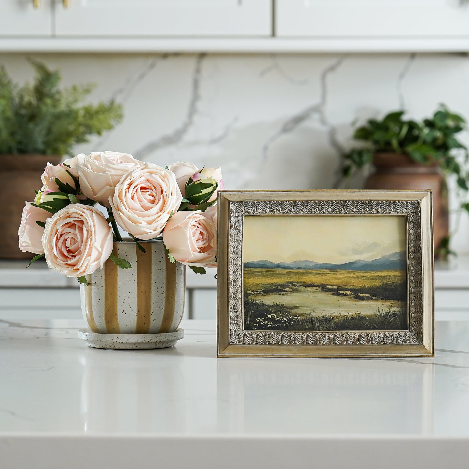 Our Real Touch Rose Bundles, Chloe Potted Fern, or Braylen Mango Wood Tray for a layered and inviting display.