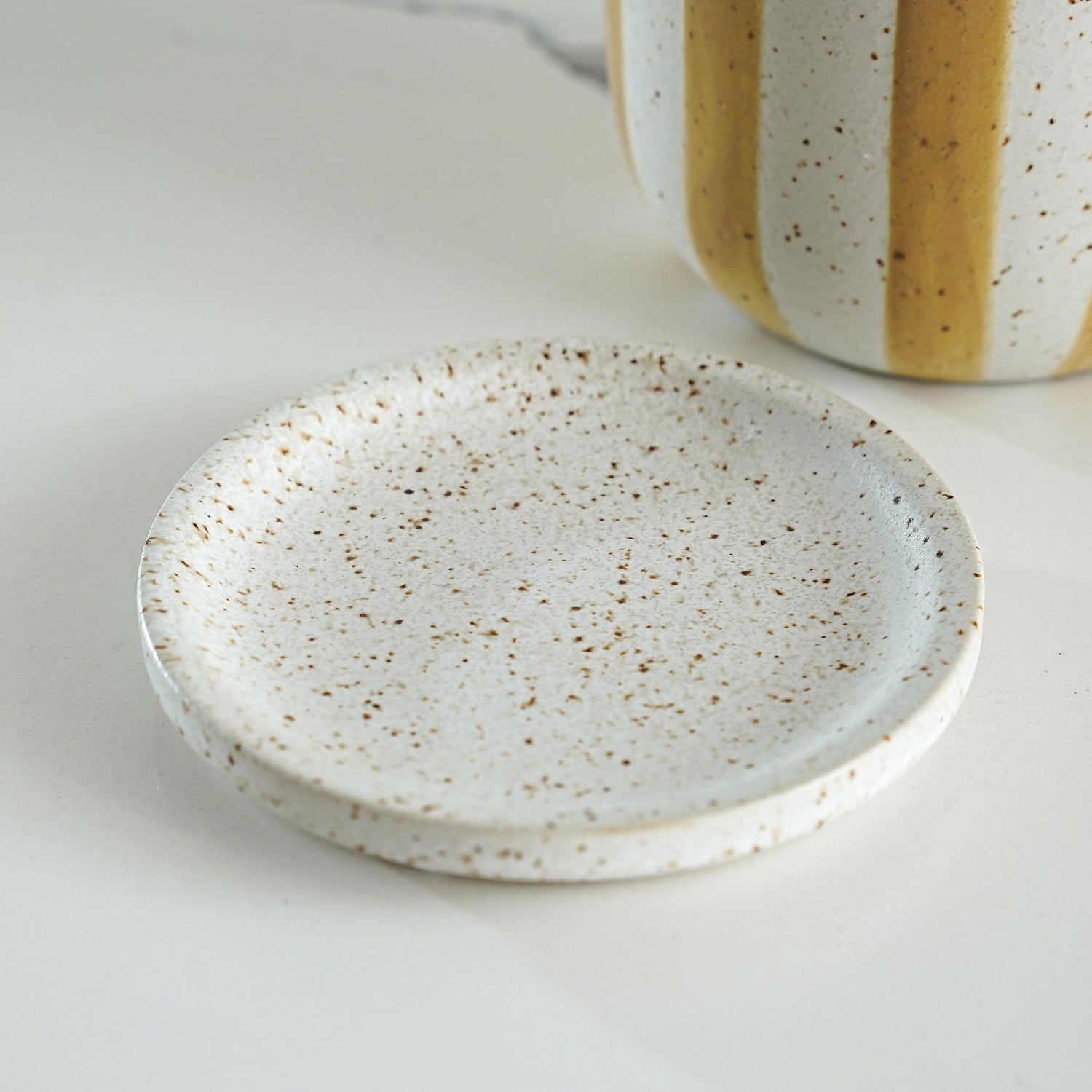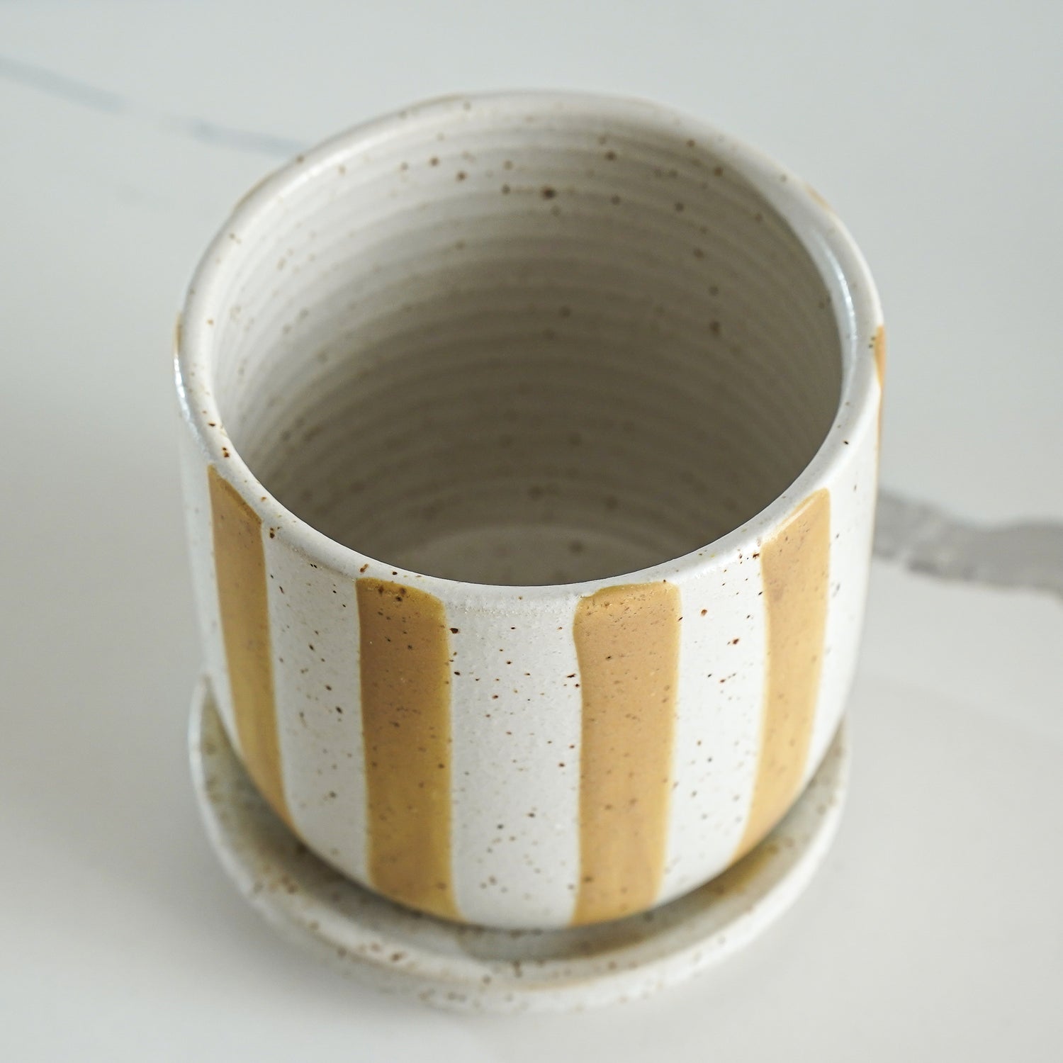 Add cheerful charm to your space with our Golden Stripe Planter. Featuring warm golden-yellow stripes on a speckled matte ceramic finish, this planter includes a matching saucer to protect your surfaces. Perfect for your favorite faux or real plant, it brings a fresh pop of color while keeping your styling neutral and versatile.