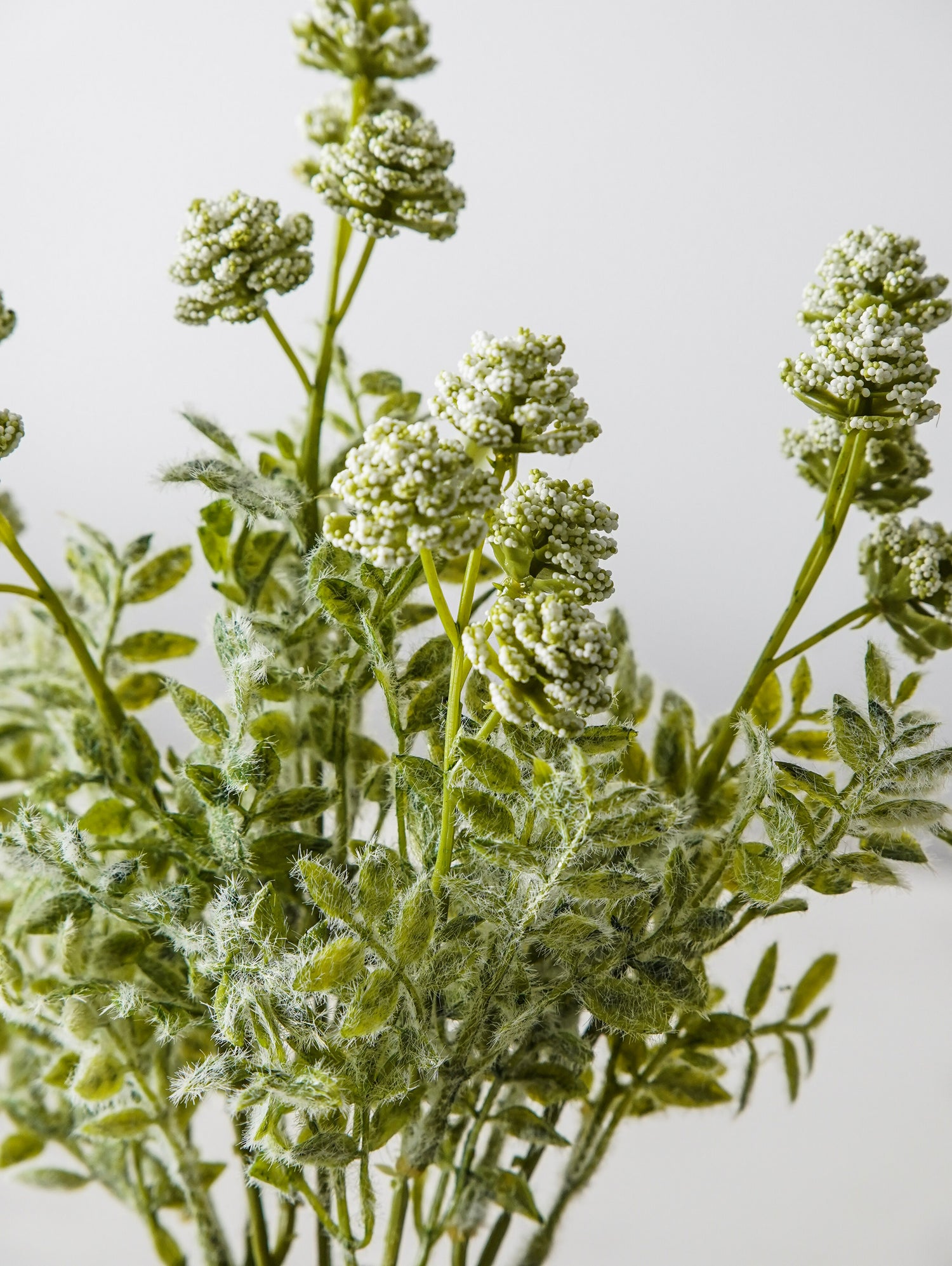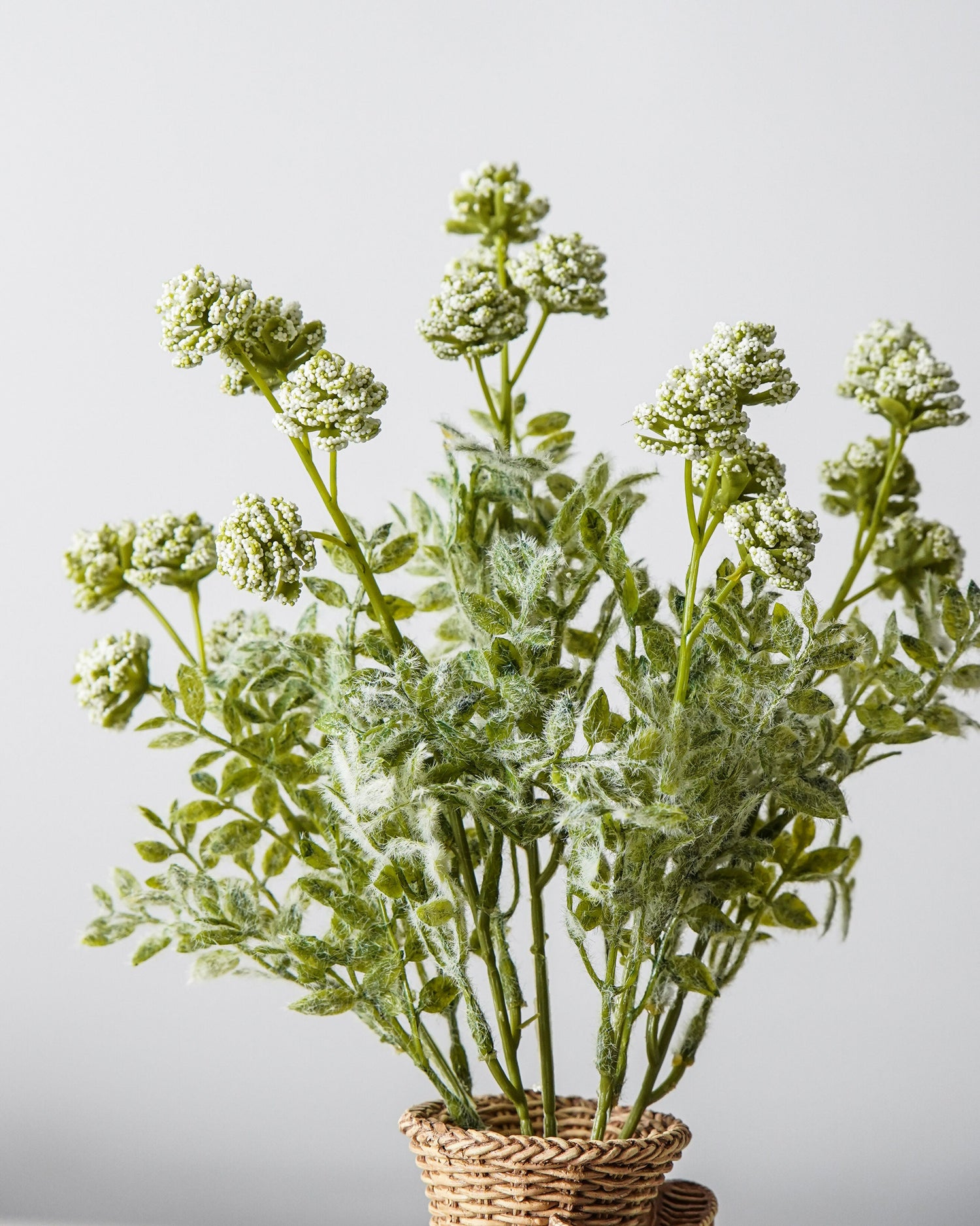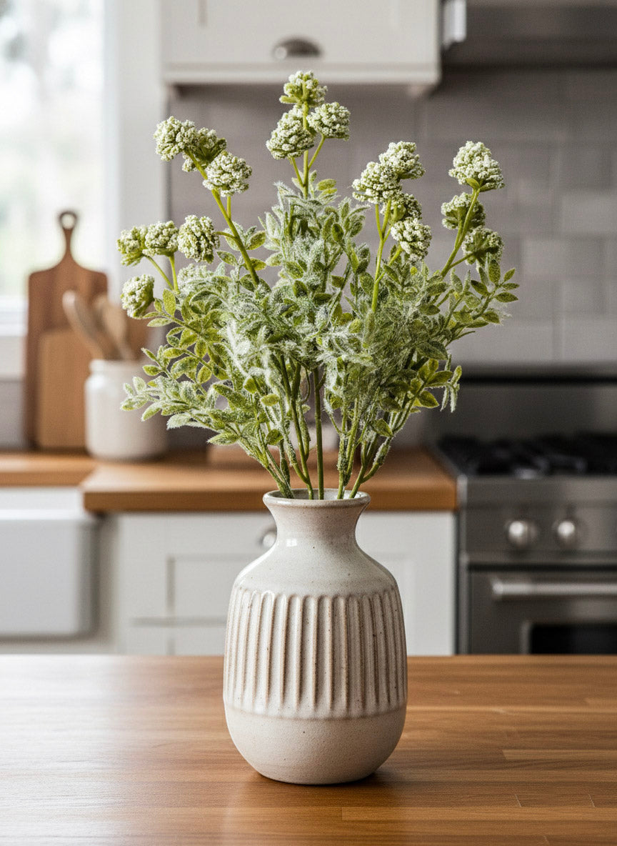 The Bubble Berry Buds Bush brings soft texture and playful dimension to your greenery styling with its rounded berry clusters and layered foliage. Designed with felted, textured leaves and flexible wire stems, this faux bush offers a gathered look that feels both fresh and naturally styled. Its compact size makes it easy to tuck into vases, crocks, or seasonal arrangements for added fullness. Effortless and versatile, it adds a gentle botanical accent to shelves, tabletops, and everyday décor.