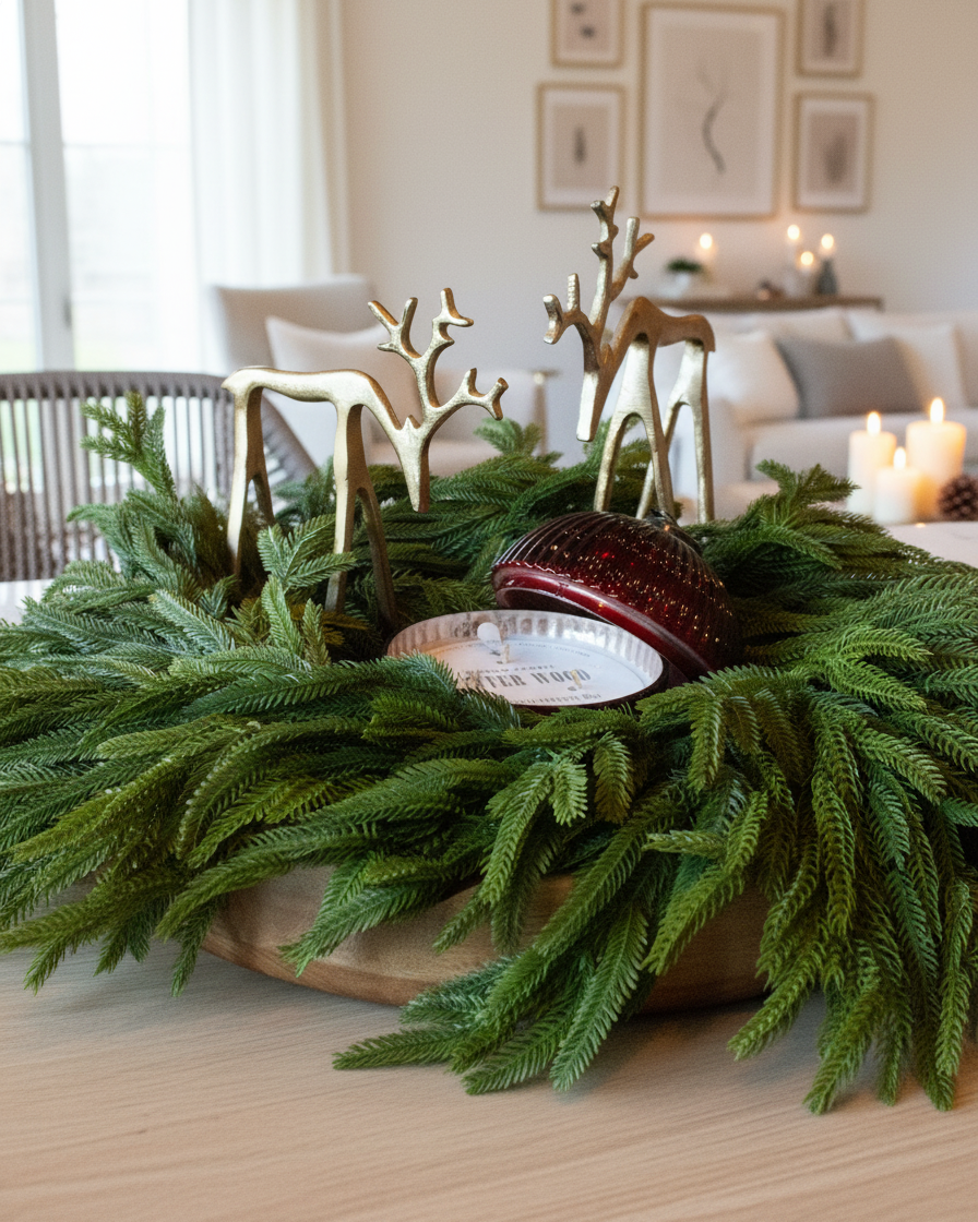 Nestle the red mercury candle inside the Norfolk wreath and position the gold deer around it for a warm, glowing focal point with elegant winter charm.