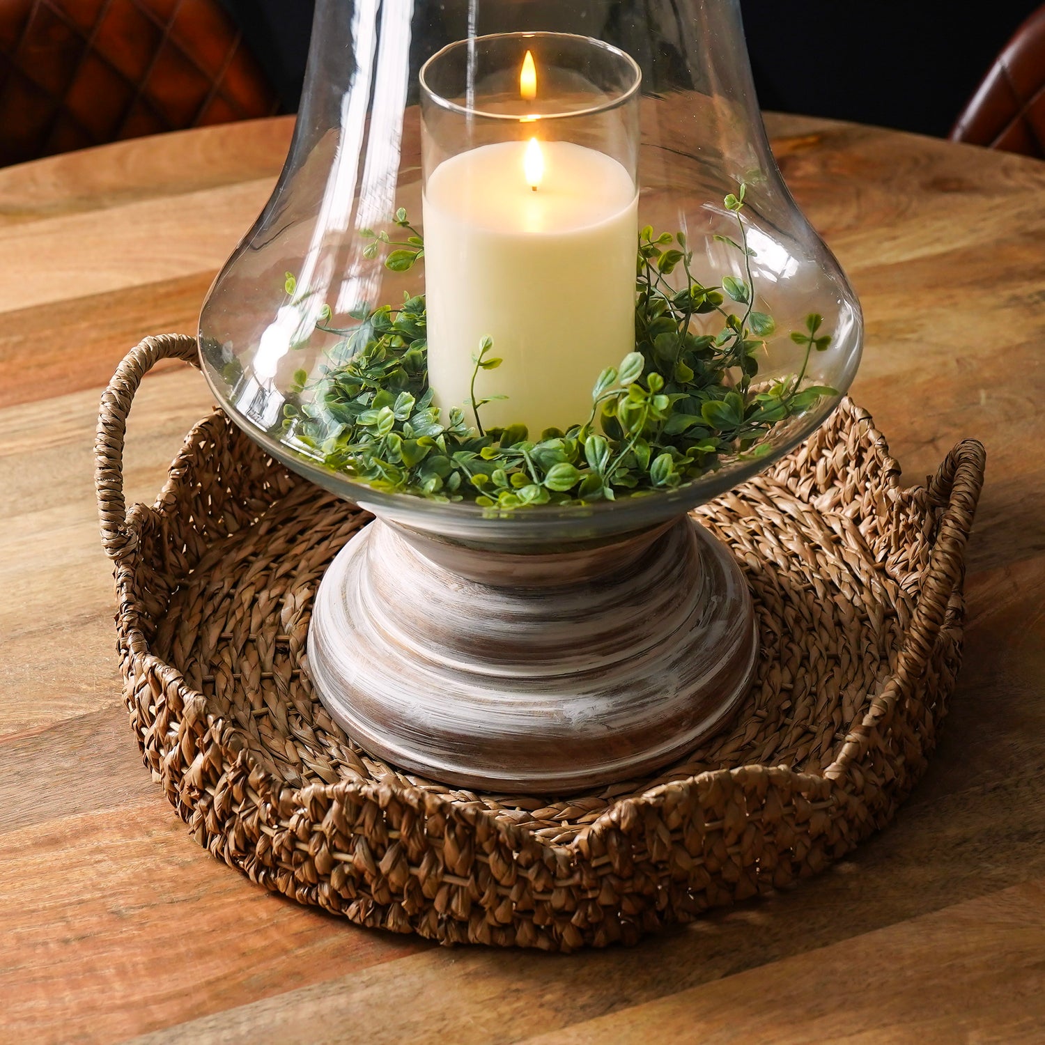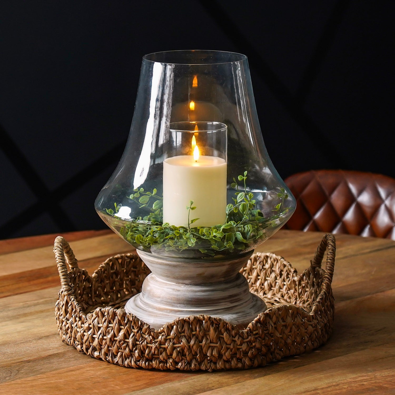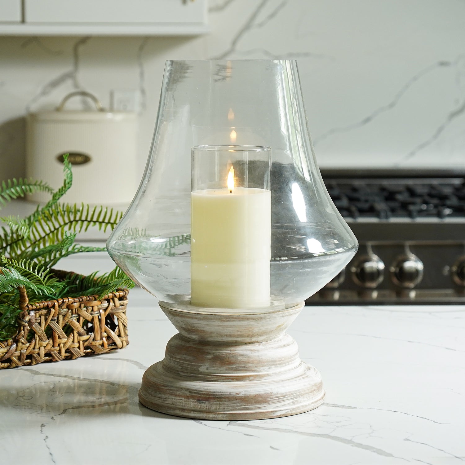 Elevate your home decor with our Camilla Glass and Wood Hurricane. Crafted with hand blown glass, this epic piece will surely catch the eye of all your guests. Make it the center piece of your living space and bring a touch of elegance to any room.
