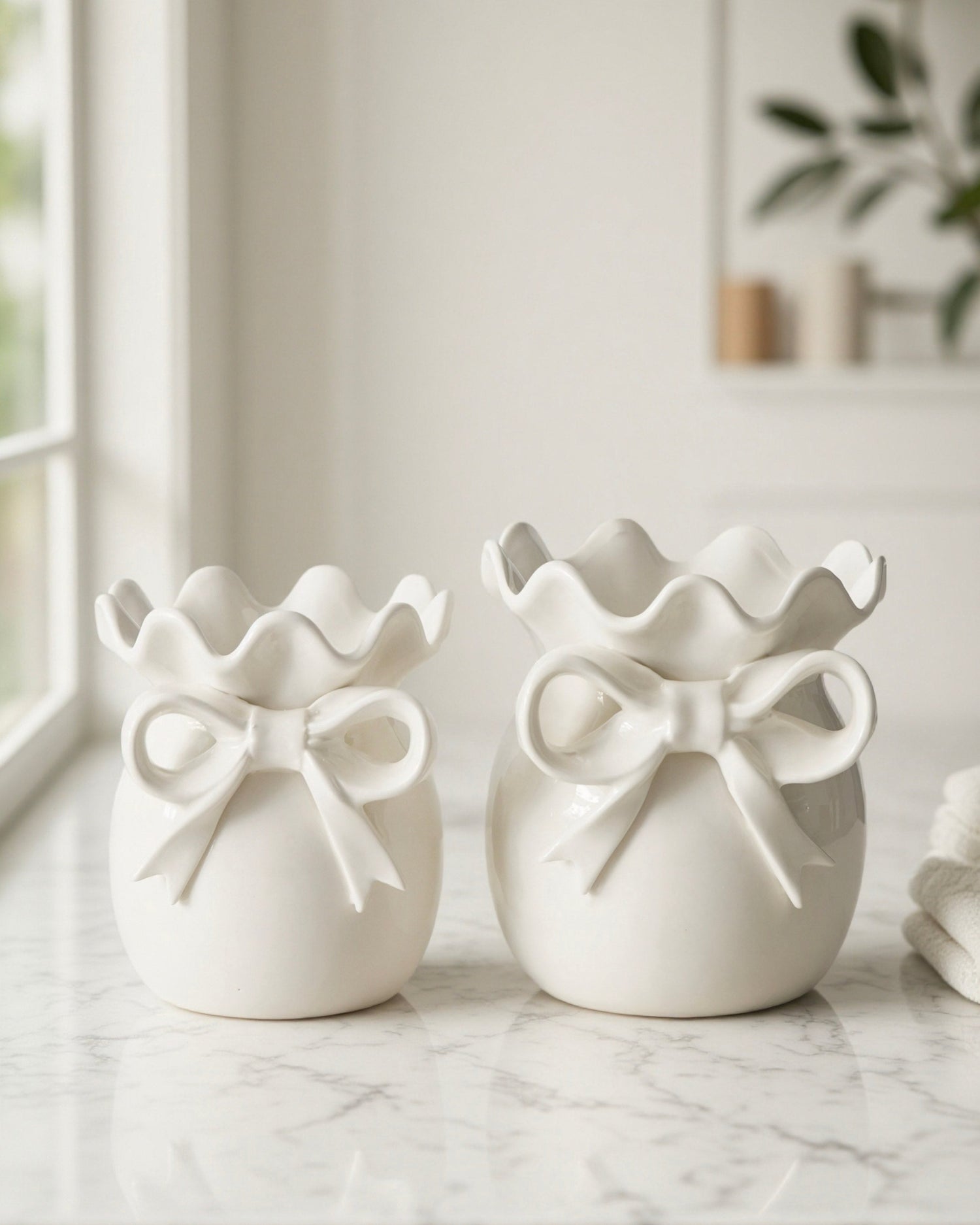 The Cleo Bow Vase brings a soft, romantic touch to your home with its sculptural silhouette and charming dimensional bow detail. Crafted from ceramic, this piece features a gently ruffled rim that adds movement and elegance while maintaining a timeless feel. Its graceful shape makes it perfect for styling fresh stems, faux florals, or displaying on its own as a decorative accent. Both playful and refined, it is a beautiful addition to shelves, consoles, or tabletop vignettes.