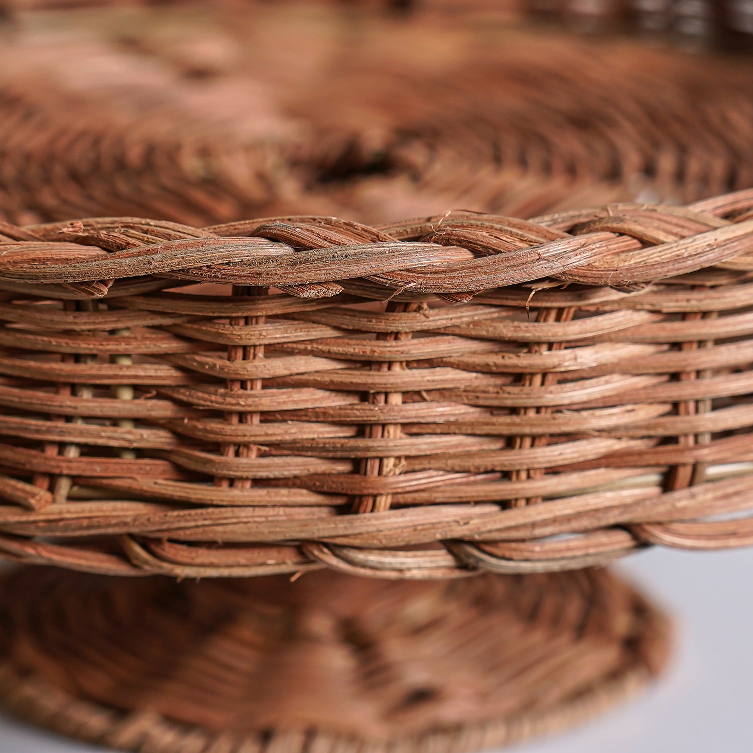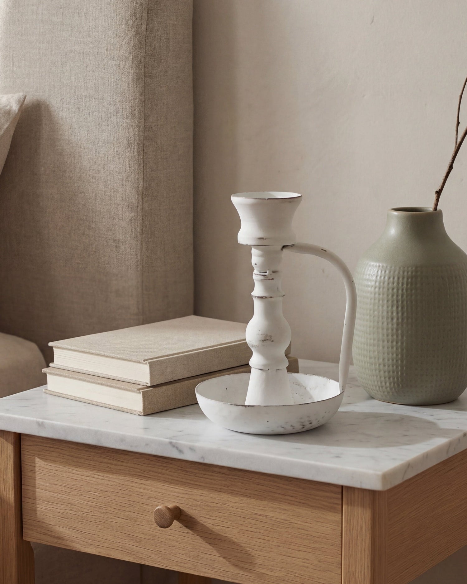 The hand-woven rattan pedestal adds height and organic warmth, grounding the arrangement while allowing each piece to stand out on its own. Crisp white taper holders bring contrast and subtle elegance, while fresh greenery softens the composition and adds movement. Finished with a sculptural lamb accent, the look feels intentional yet relaxed, perfect for dining tables, consoles, or kitchen islands.
