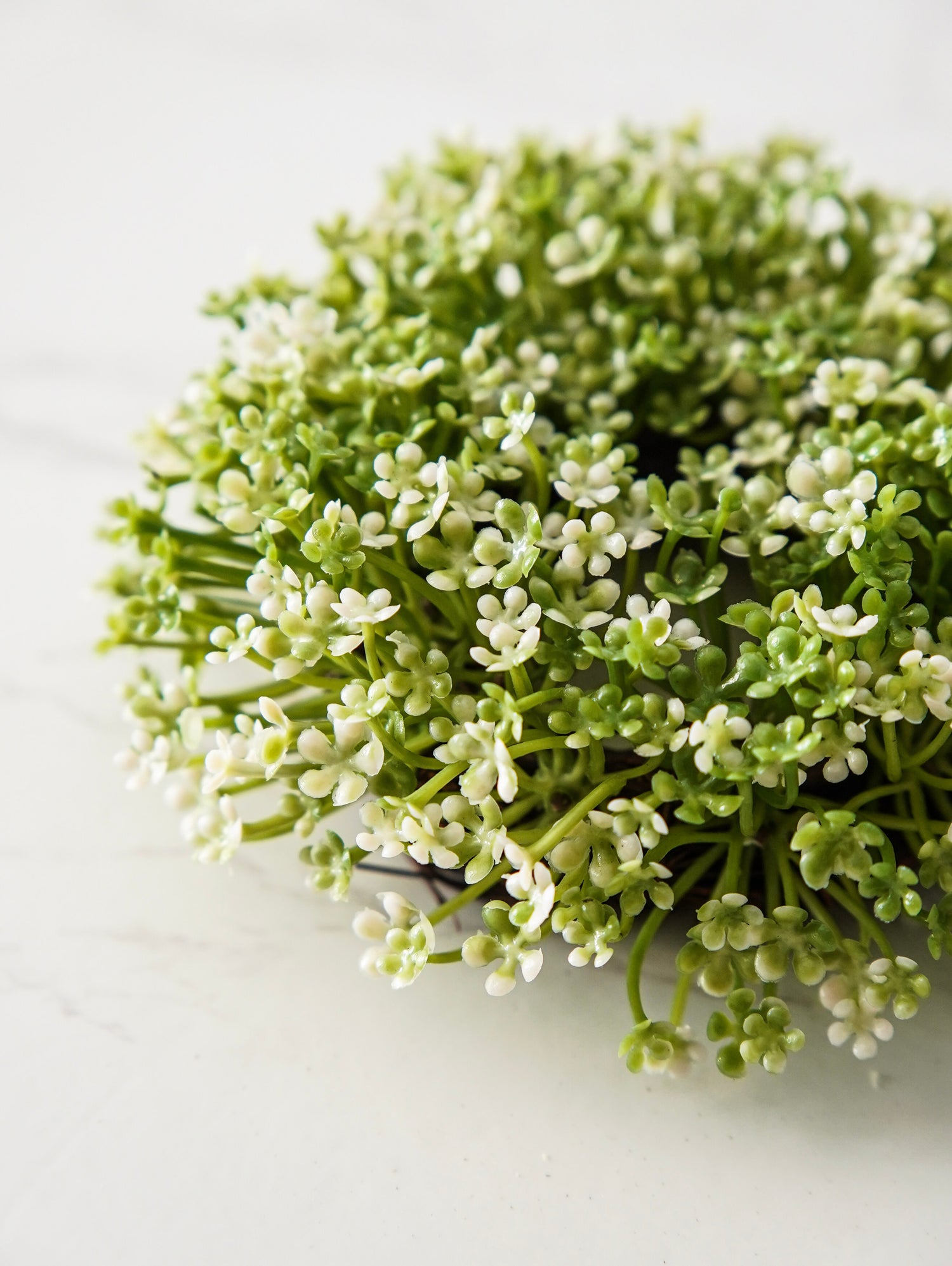 The Ella Blooms Small Candle Ring brings a delicate touch of greenery and soft floral texture to your styling with its petite, gathered design. Crafted with layered blooms and greenery on a natural grapevine backing, this piece offers a fresh, lightly romantic feel. Its smaller size makes it perfect for accenting taper bases, small candles, or decorative vases. Thoughtfully designed and easy to style, it adds a gentle botanical detail to shelves, trays, or tabletop displays.