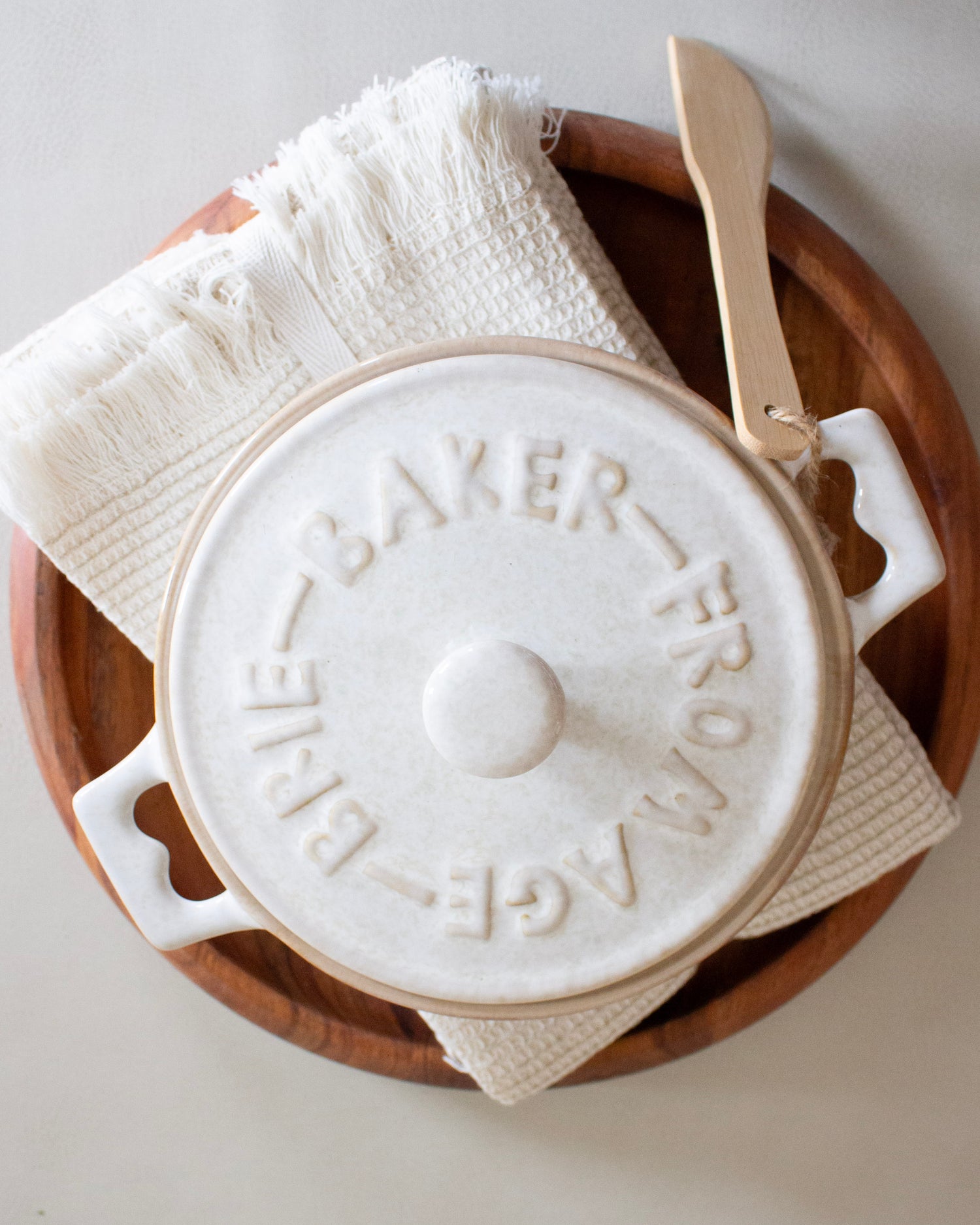 Elevate your entertaining with the cozy charm and functionality of our Eloise Brie Baker. Crafted from smooth, durable ceramic, this beautifully designed dish perfectly warms brie, dips, and small baked appetizers for effortless hosting. The coordinating wood spoon adds a natural touch and makes serving both simple and stylish. With its soft, neutral tone and timeless silhouette, it transitions seamlessly from oven to table, making every gathering feel warm, inviting, and thoughtfully prepared.