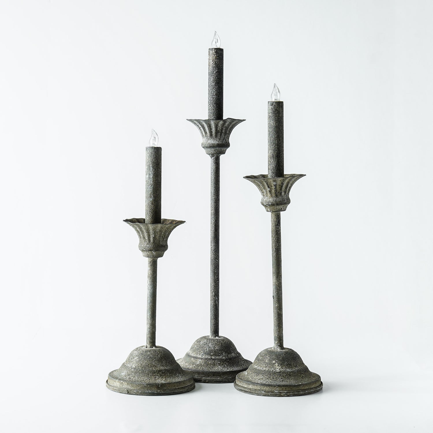 Bring timeless character and warm candlelight to your home with our Ester Iron Taper Candle Holders. Each piece is crafted from iron with a textured, distressed finish that lends an artisanal, timeworn feel. Designed with built-in LED functionality, these holders softly glow with the look of a classic taper candle while offering the convenience of a battery-powered design and an automatic 6-hour timer. Available in three sizes, they add elegant height and rustic charm to mantles, tables, or entryway displays.