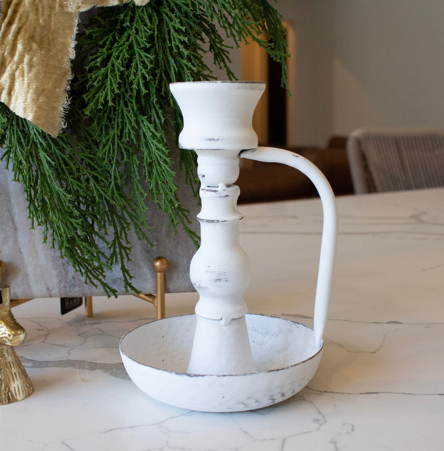 Bring soft, timeless charm to your home with our Freya Taper Holder. Crafted from metal with a matte white finish and subtle distressing, this piece blends vintage character with modern simplicity. Its sculpted silhouette and warm patina make it a beautiful accent for mantles, tables, or shelves throughout the seasons.
