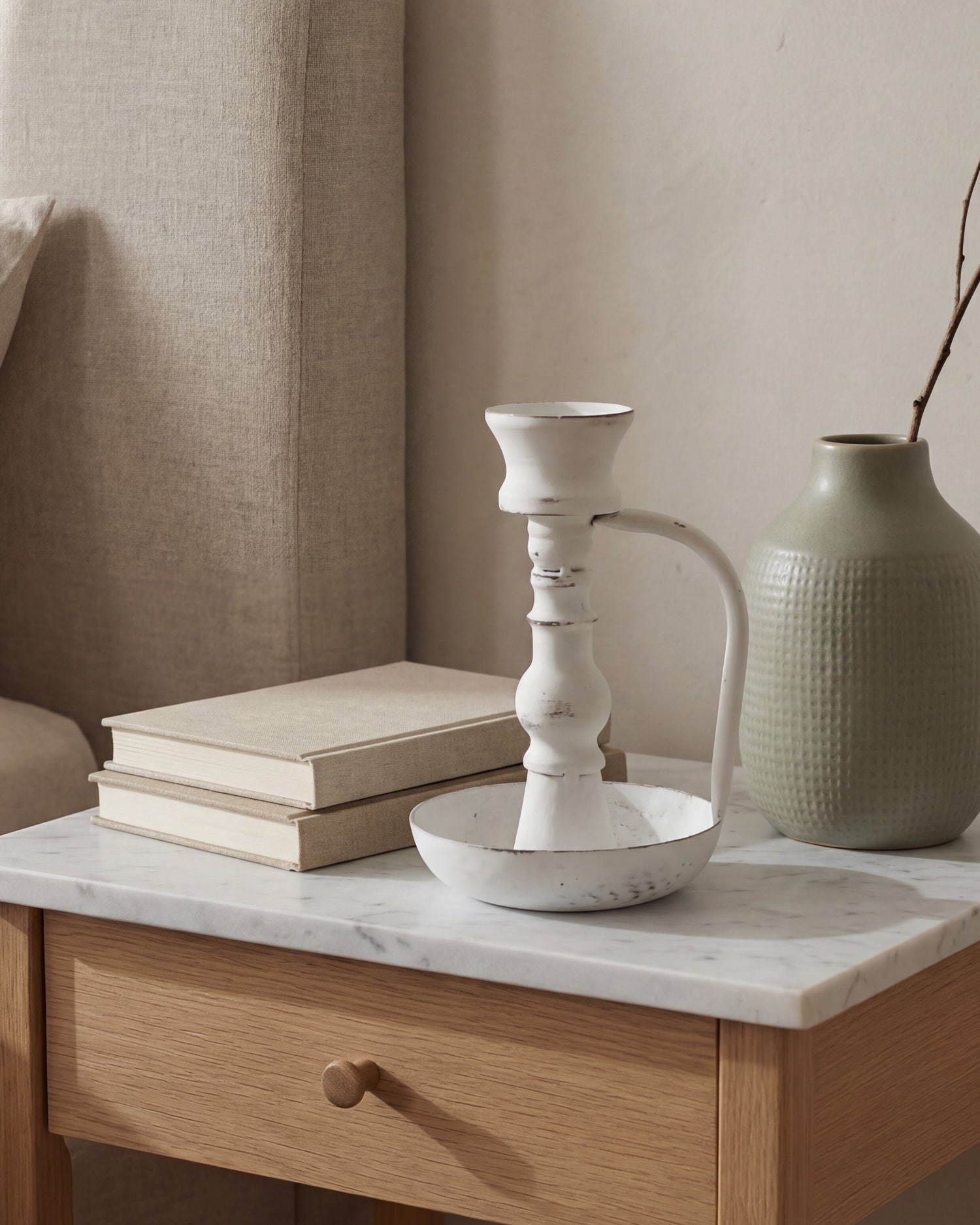 Bring soft, timeless charm to your home with our Freya Metal Taper Holder. Crafted from metal with a matte white finish and subtle distressing, this piece blends vintage character with modern simplicity. Its sculpted silhouette and gently weathered patina make it a beautiful accent for mantels, dining tables, or shelves. Designed to style effortlessly through the seasons, it adds warmth and understated elegance wherever it’s placed.