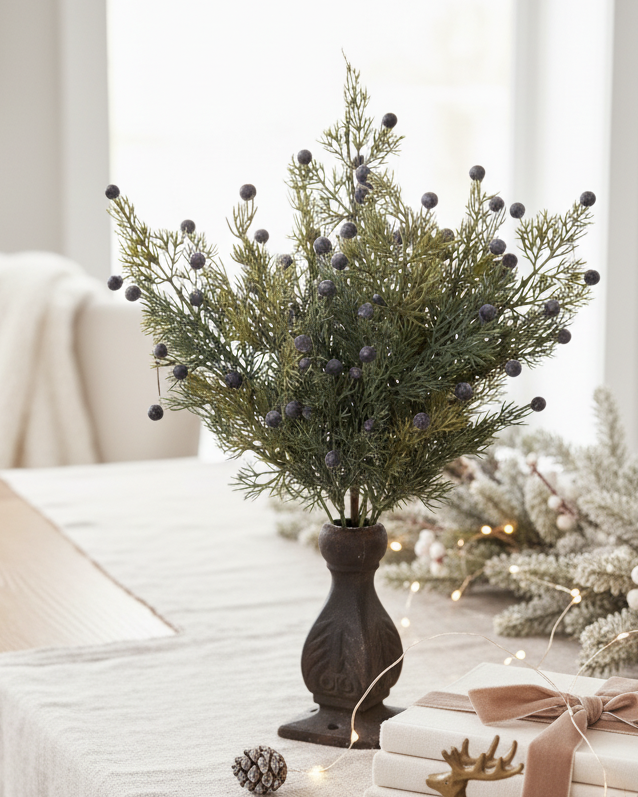 Bring a soft, wintry touch to your seasonal arrangements with our Juniper Berry Bush. Featuring lifelike greenery with blue berries and a lightly powdered finish, this 18" bush offers a realistic, freshly foraged look. Its plastic stem makes it easy to shape and style in vases, wreaths, or centerpieces, adding natural texture and subtle color to your holiday décor.