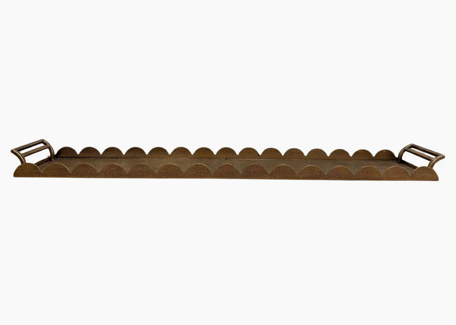 The Scallop Metal Gold Tray is a striking accent that blends rustic character with refined elegance. Crafted from metal with a beautifully textured surface, this elongated tray features softly wavy edges and a warm gold finish that adds subtle depth and interest. Sturdy metal handles on each end lend an industrial touch while offering practical functionality. Perfect for styling consoles, dining tables, or kitchen counters, this tray brings a sense of intention and elevated charm to any space.