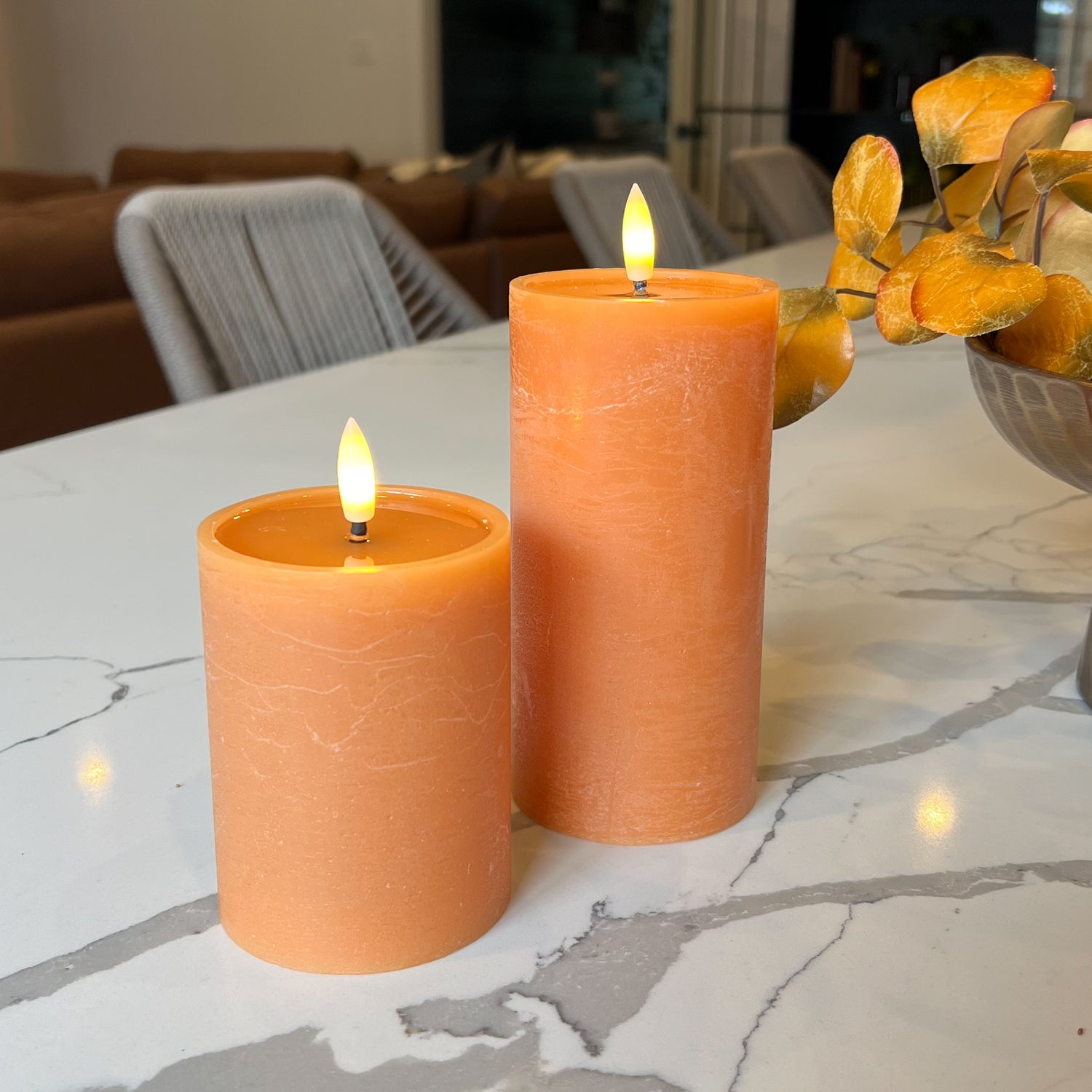Group this pillar candle with varying sizes of LED candles for layered dimension, or display inside lanterns and hurricane holders for a cozy seasonal statement.