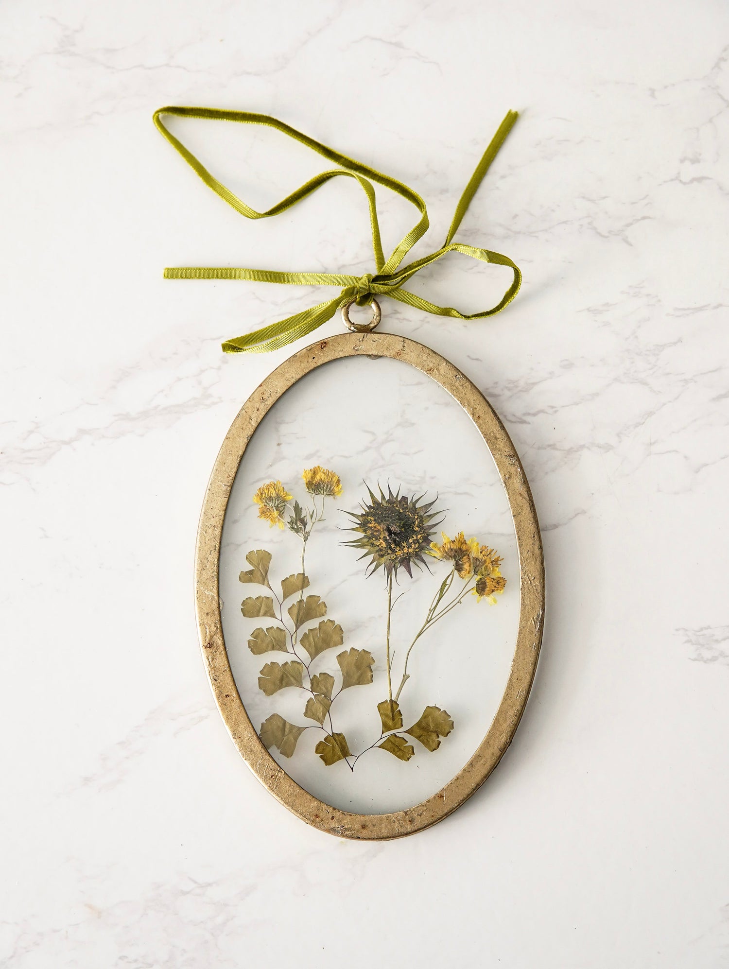 The Pressed Botanical Frame Bundle offers a delicate, nature-inspired collection designed to bring soft greenery and timeless charm into your home. Featuring a curated mix of round and rectangular frames, each piece showcases real pressed botanicals encased between glass and framed in metal for a light, airy feel. Finished with rich green velvet ribbon hangers, these frames add gentle texture and an elegant, collected look whether styled together or throughout your space. Thoughtfully designed and beautifully detailed, this bundle creates a refined botanical moment on shelves, hooks, or seasonal displays.