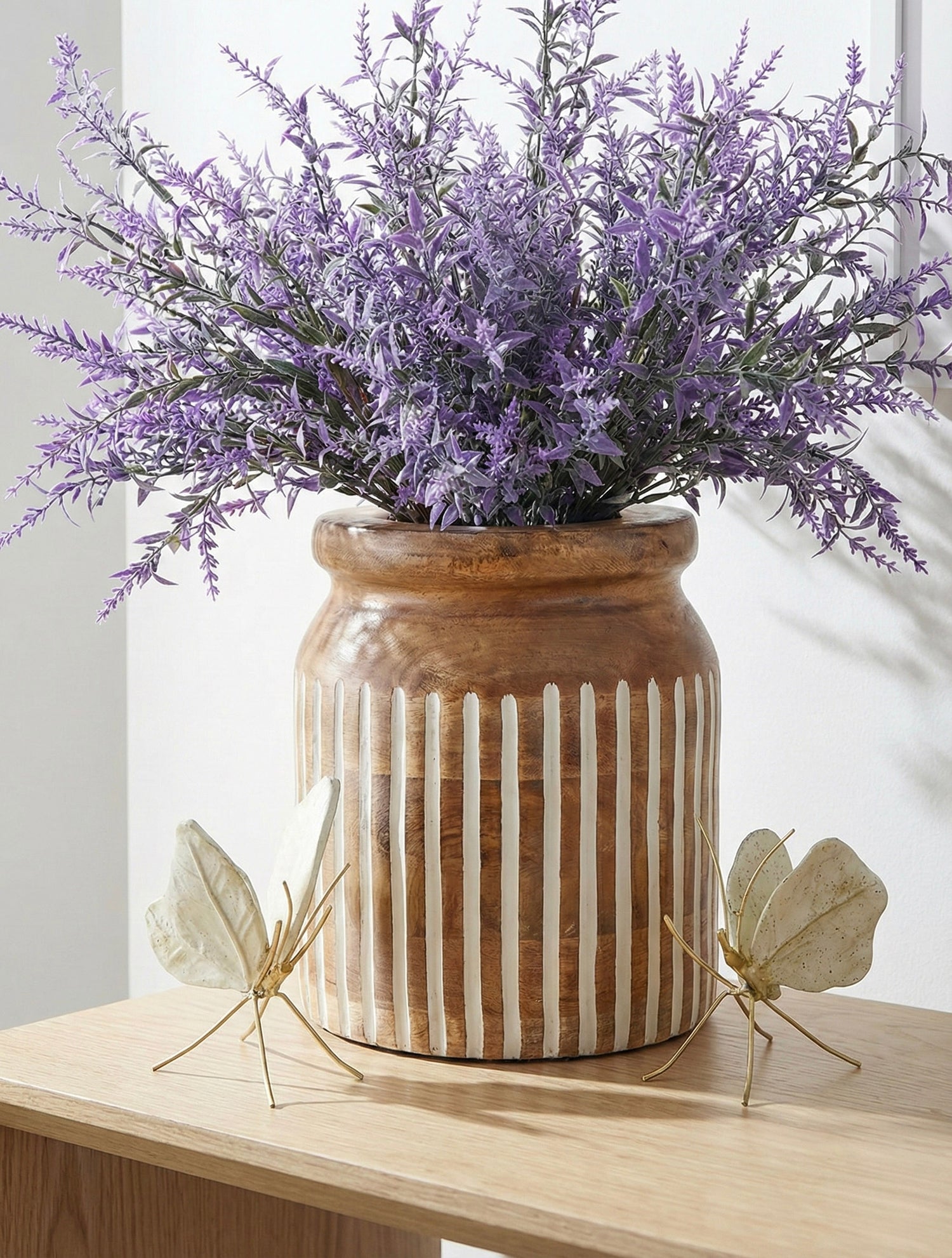 Bring warm, organic texture into your home with our Rowan Carved Wood Vase. Crafted from mango wood, each vase features hand-carved white line detailing that highlights the natural character and grain of the wood. Available in two sculptural sizes, each sold separately, the rounded silhouettes make a beautiful statement styled with faux stems or showcased on their own. Timeless, earthy, and artisan, this piece adds depth and handcrafted charm to consoles, shelves, or tabletops year-round.