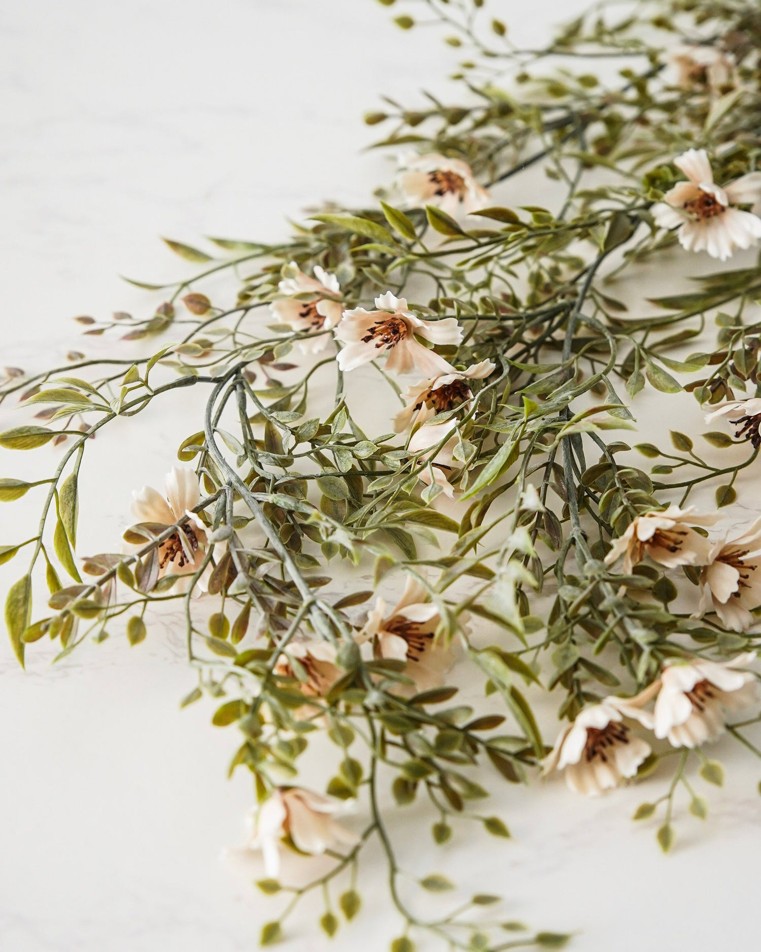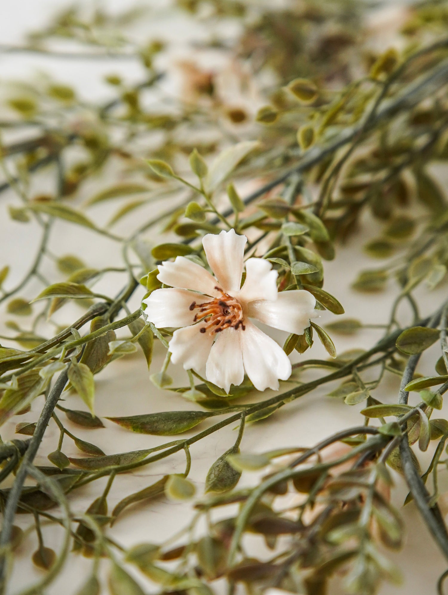 The Stella Cosmo Hanging Stem brings soft movement and airy texture to your greenery styling with its delicate, cascading silhouette. Designed with a slightly powdered finish, this faux stem offers a freshly gathered look that feels calm and naturally refined. Its extended length makes it perfect for draping from vases, shelves, or baskets to create a relaxed, layered effect. Effortless and timeless, it adds gentle botanical beauty to any space.