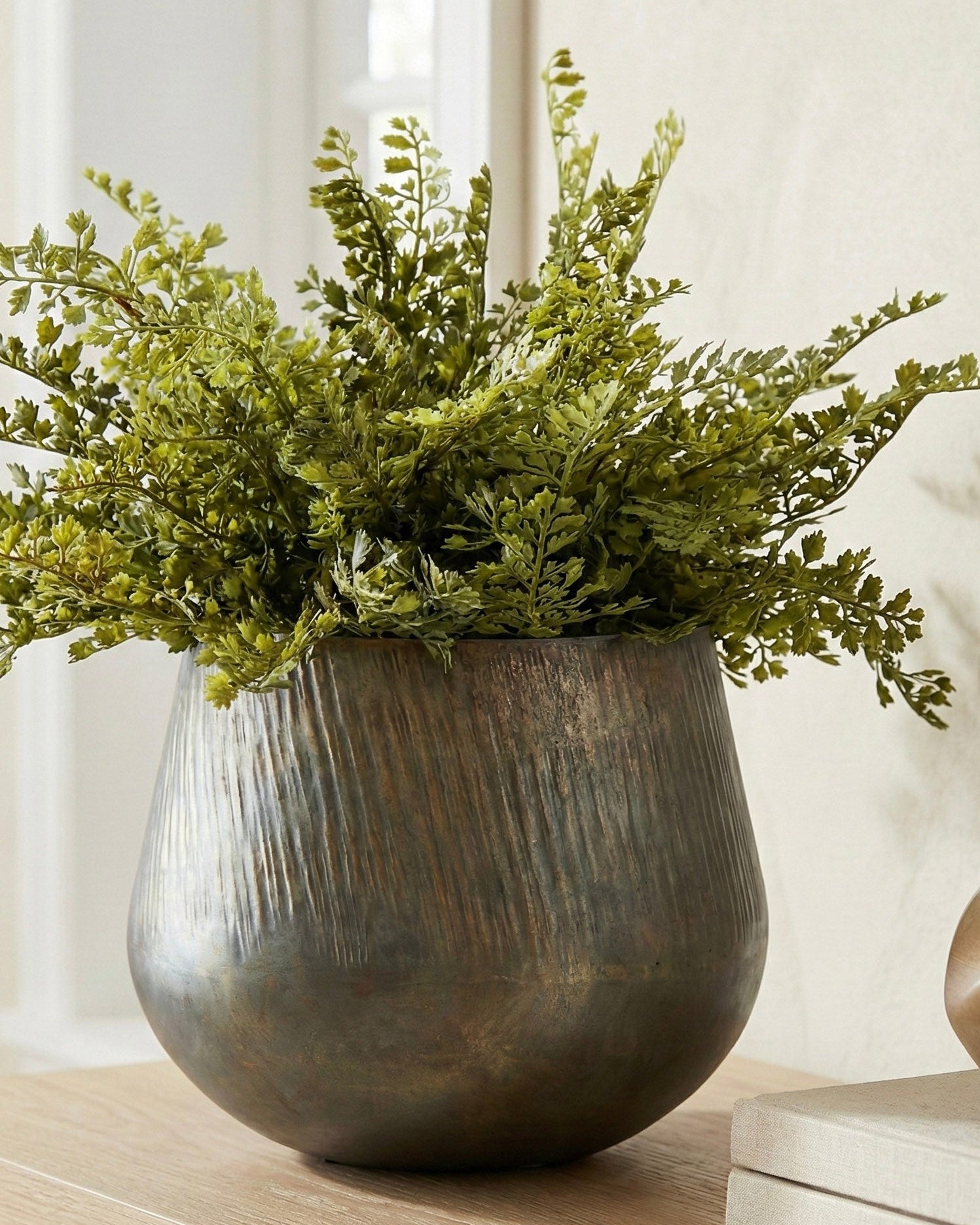Grounded and organic, this look layers lush greenery with a richly textured metal vase for a warm, lived-in feel. Perfect for those who love neutral spaces with depth and character, it adds visual weight without feeling heavy.