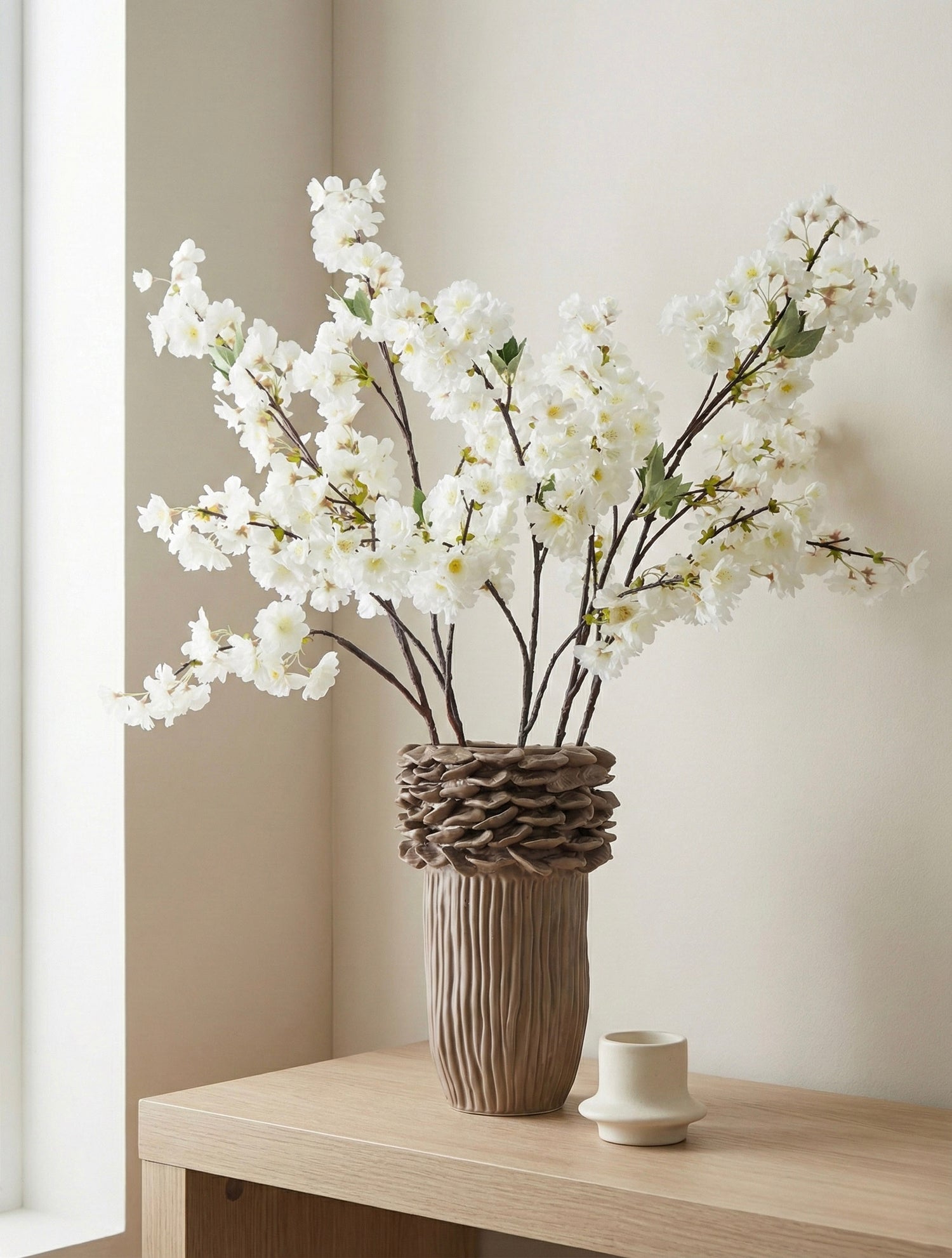 Bring soft elegance and airy movement into your home with our White Cherry Blossom Spray. Designed with lifelike blossoms and gently branching stems, this faux floral adds a refined, graceful touch to any space. Its crisp white blooms and neutral tones blend seamlessly with both modern and classic décor, making it a timeless styling staple. Whether used alone or layered into an arrangement, it instantly elevates your space with a fresh, serene feel.
